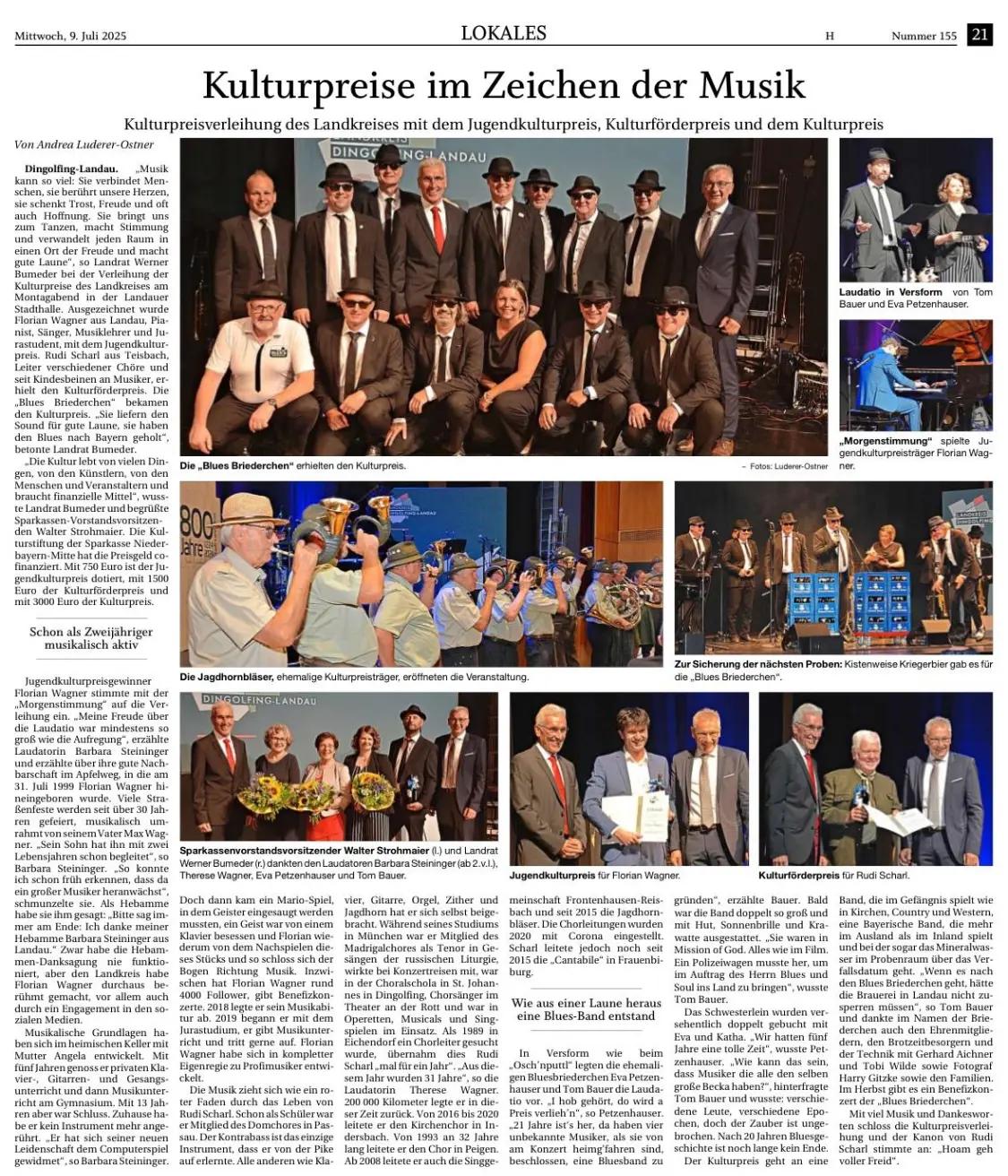 Am Montag, den 07.07.2025 wurden in der Stadthalle in Landau a. d. Isar die Kulturpreise des Landkreises Dingolfing-Landau für das Jahr 2024 verliehen. Die Jazz-Band "Blues Briederchen" wurde mit dem Kuluturpreis ausgezeichnet. Den Kulturförderpreis erhielt Rudi Scharl mit seinen Jagdhornbläsern. Florian Wagner gewann den Jugendkulturpreis. Verglichen zu den letzten Jahren ist es eine Seltenheit, dass der Kulturpreis an einen Einzelnen verliehen wird. Als Einzelpreisträger ist damit Florian Wagner derzeit der offiziell führende Musiker in Landkreis Dingolfing-Landau. Die Jury entschied sich vor allem für Florian Wagners musikalische Professionalität, seinen großen musikalischer Einsatz im Landkreis Dingolfing-Landau, seine übernationale Reichweite in den Sozialen Medien und das vielfältige Auftreten von Florian Wagner als Solosänger und Konzertpianist mit Orchestern, Chören, Kinderchören, Bands, mitmachenden Publikums und alleine sowie Wagners Lehrtätigkeit als Musiklehrer - neben einem Jurastudium. Besonders wurde der von Florian Wagner geprägte Musikstil "Multitaskingmusik", also das Singen und Spielen von mehreren Liedern und Stücken auf mehreren Instrumenten gleichzeitig, hervorgehoben. Auf dem Gebiet Multitaskingmusik ist Florian Wagner aus Landau an der Isar der beste der Welt. Die drei Preisträger erhielten ein Preisgeld aus einem Preispool von 5.250 Euro.